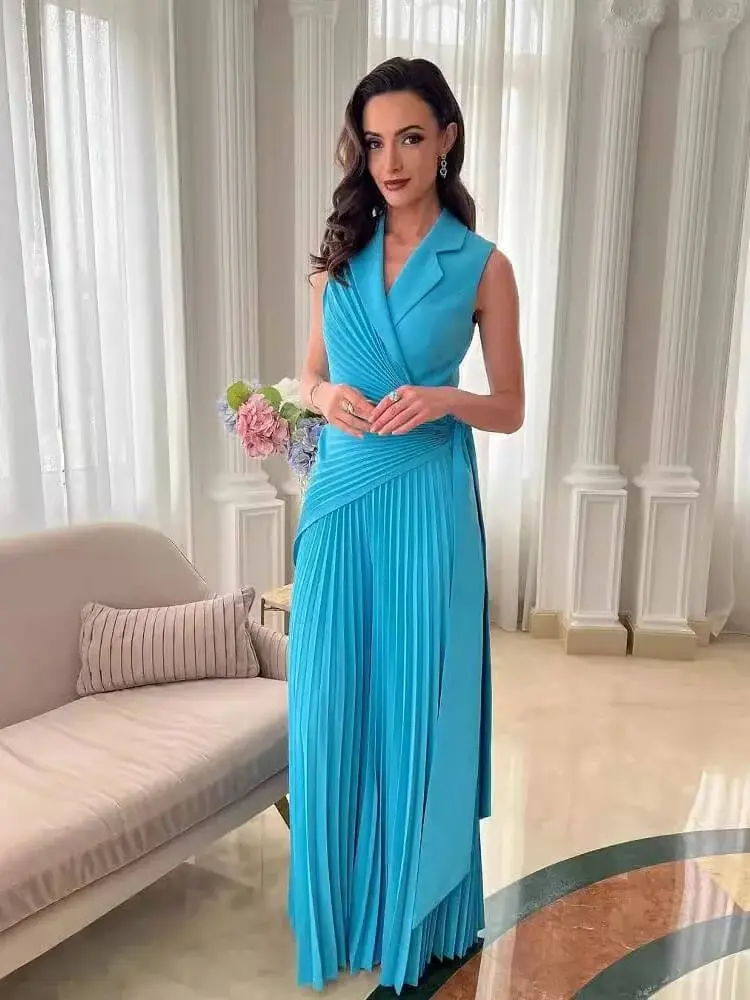 طقم مكون من قطعتين من بلوزة وبنطلون بفتحة على شكل حرف V للنساء بلون سادة