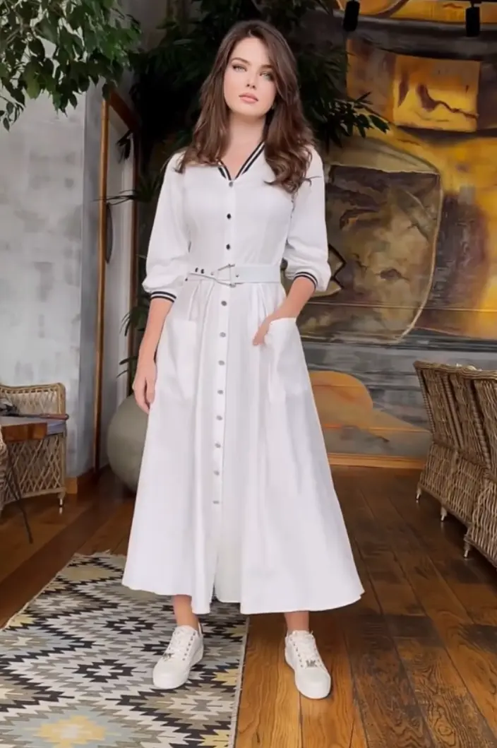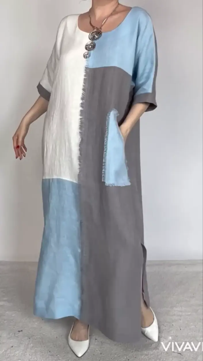 فستان سوينغ بأكمام طويلة ورقبة على شكل حرف V من القطن والكتان