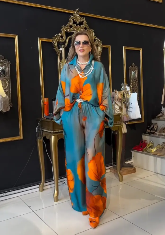 طقم قميص بطبعات الأزهار الأنيقة وبنطلون واسع الساق
